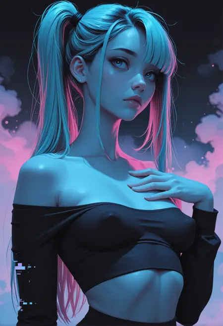 detailed skin, detailed eyes, shadows, dark light, eyelashes, upper body, cheeky, posing, holographic color,
