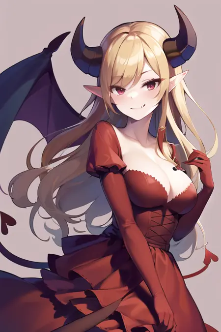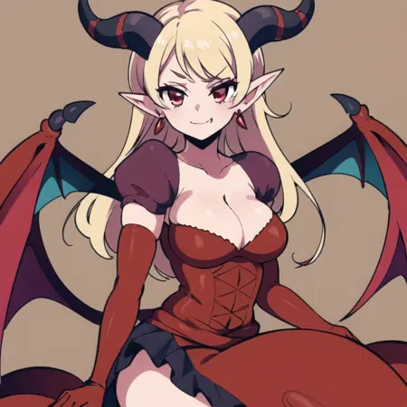 The trigger works by itself but you can add extra prompts for more control: gloves, cleavage, jewelry, earrings, red eyes, demon horns, demon wings, tail, elbow gloves, dress, ruffled skirt