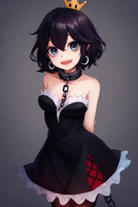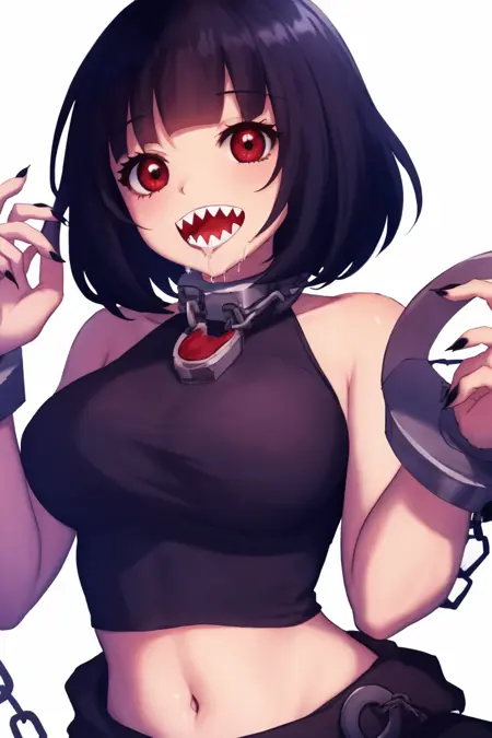 Prompt example: (masterpiece, best quality:1.2), chompette, long hair, looking at viewer, smile, large breasts, gloves, dress, cleavage, hair between eyes, jewelry, collarbone, short sleeves, earrings, teeth, black gloves, elbow gloves, puffy sleeves, black dress, collar, puffy short sleeves, grey eyes, chain, sharp teeth, cuffs, shackles, scenery