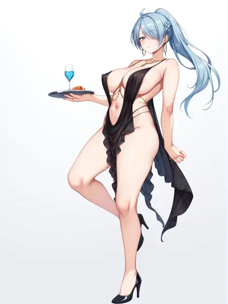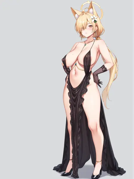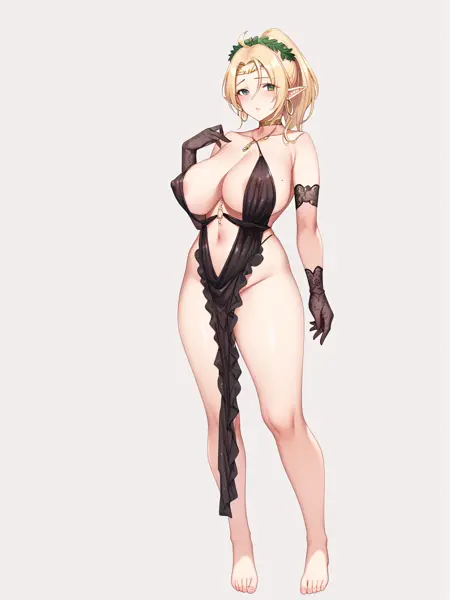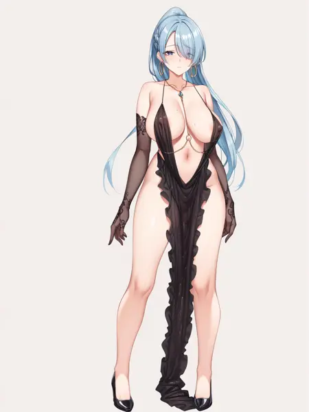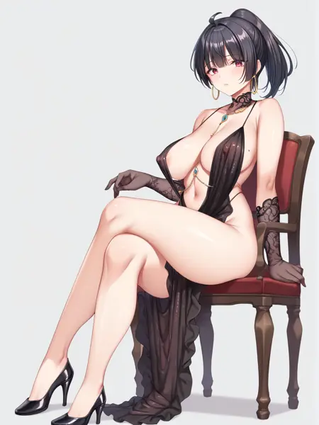 1girl, large breasts, dress, navel, cleavage, bare shoulders, jewelry, thighs, earrings, necklace, black dress, covered nipples, high, revealing clothes, areola slip, mole on breast, hoop earrings, lace trim, lace, areola slip, gloves