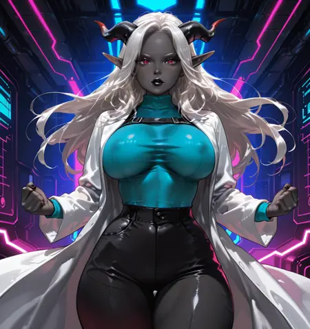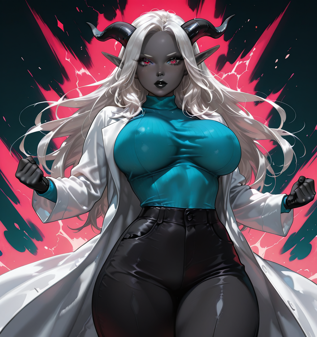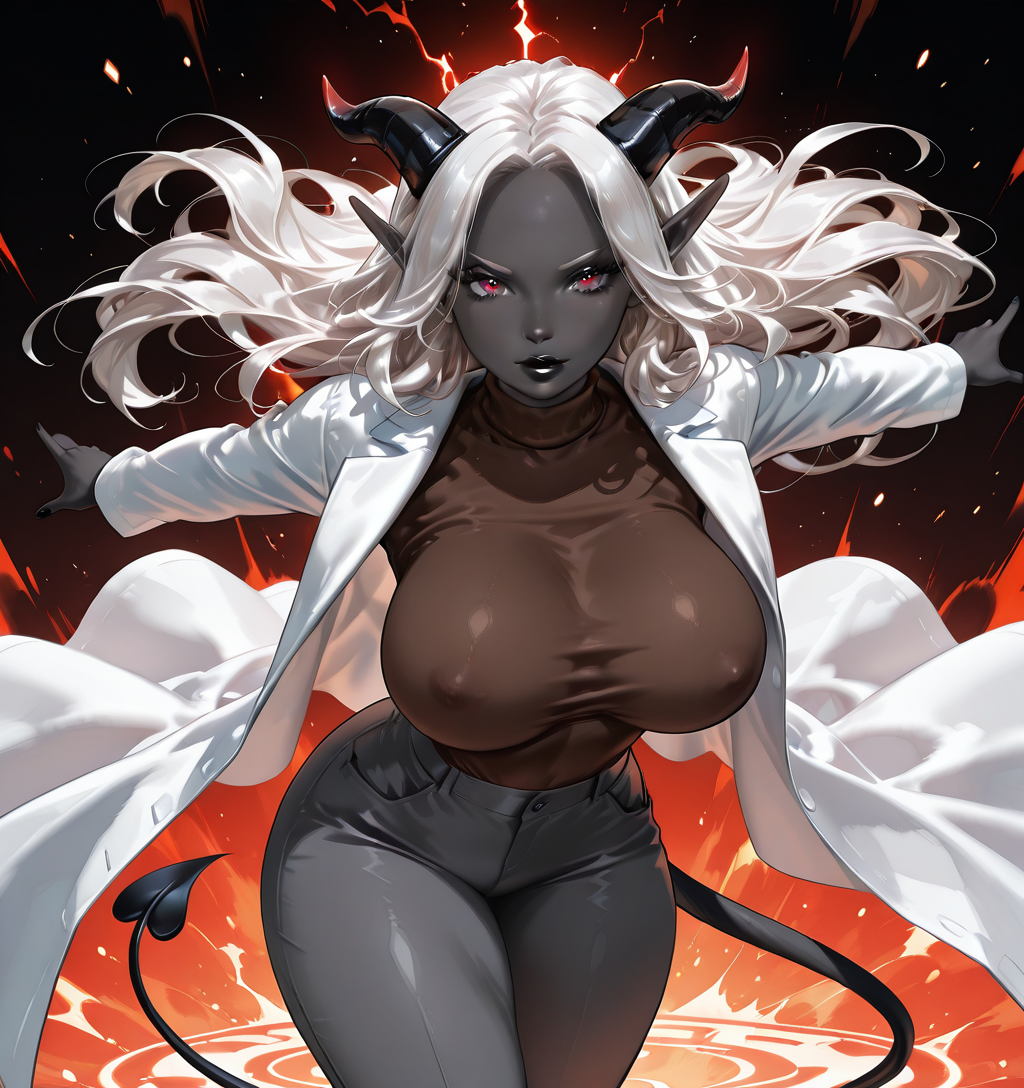 1girl, 1人の悪魔女性のポートレート、黒い肌、暗い肌、色付きの肌、黒い唇、白い髪、長い髪、細い顔、黒い唇、エルフの耳、黒い悪魔の角、((大きな胸))、((赤い目))、((太ももの厚い))、zoe