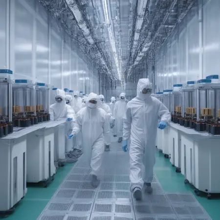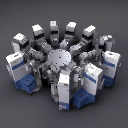 一个高度自动化的工业设施场景,配备大量机械臂和呈网格状排列的电子元件制造设备。该布局暗示了一种前沿的制造或装配工艺,强调效率与自动化。宽敞的半导体工厂内部,一排排白色方形机柜的制造设备在抛光的白色地面上延展至视野尽头,配有自动导引车机器人、工业机器人、高科技电子零件制造设备生产线、计算机控制机械、高科技制造设备以及 overhead 传输轨道。