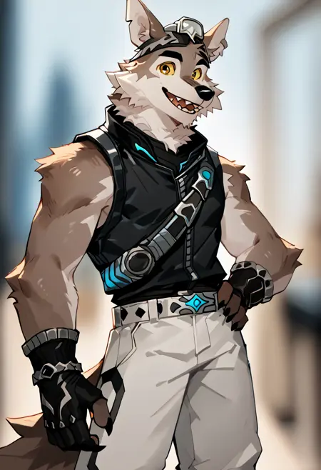 Pony: score_9, score_8_up, score_7_up, high res, best quality, wendell, fortnite, furry, wolf, 1boy, solo, muscular, tail, fingerless gloves, ...your tags...