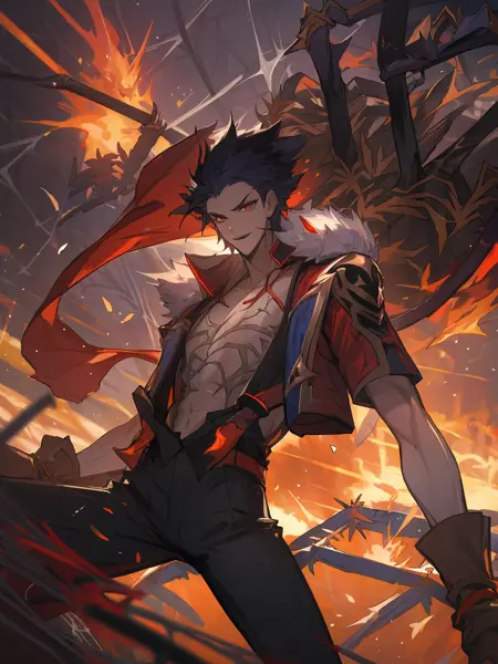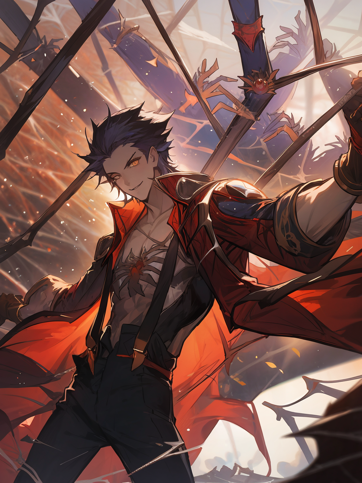 Alternative2(spider-man):black hair,forehead,yellow eyes,suspenders,red open jacket,muscular,scar,goggles,black pants,bow,ribbons,(cape),banages,(holding weapon,huge weapon,sword),(spider elements like spider web,spider legs)