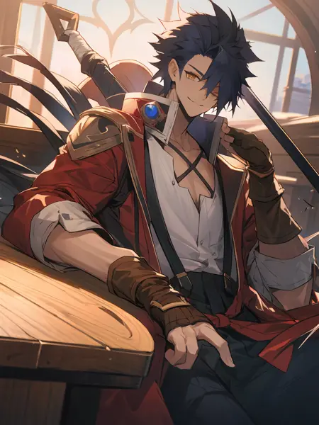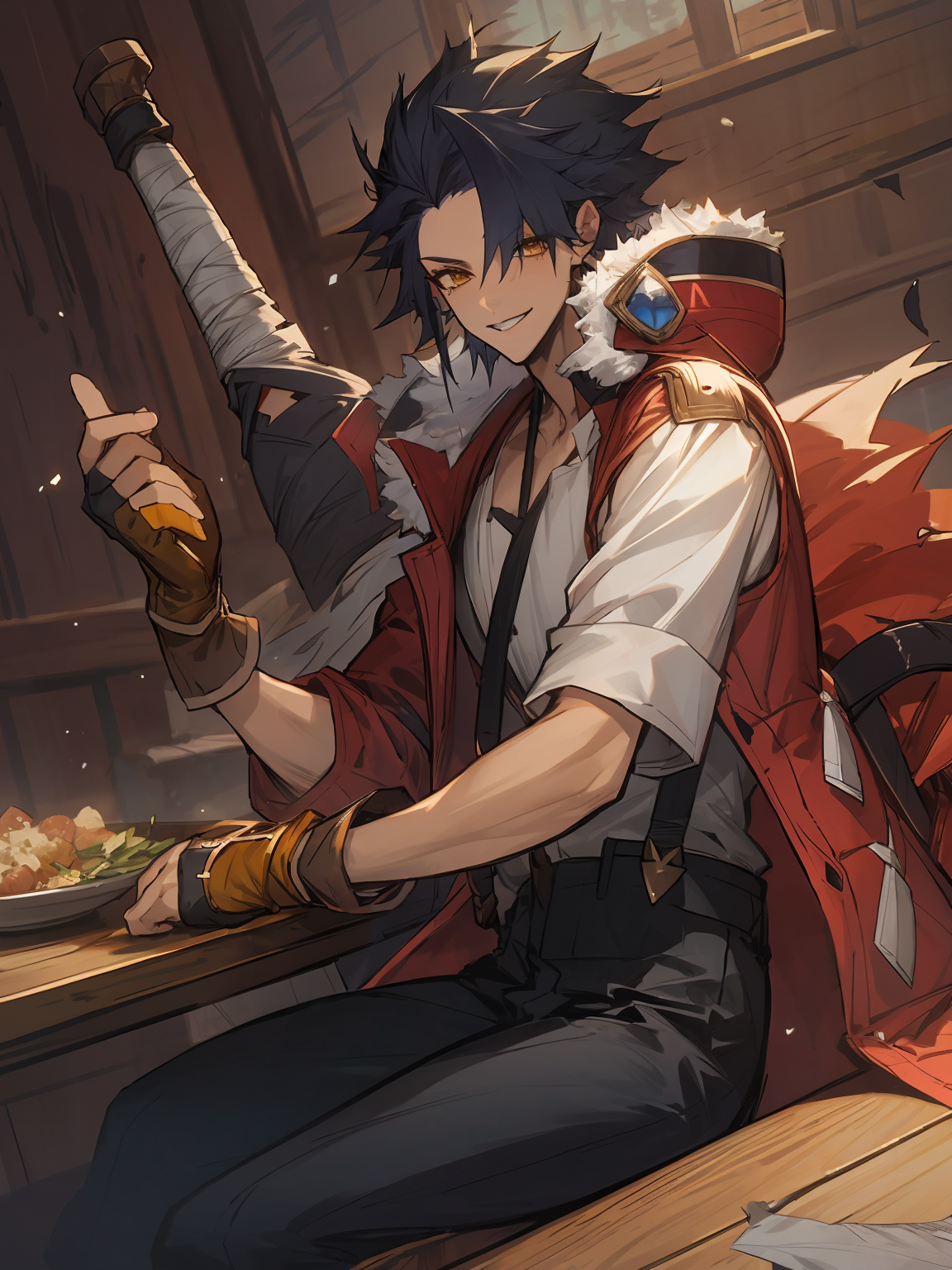 Alternative1(formal):black hair,hair over one eye,yellow eyes,suspenders,red open jacket,white shirt,goggles,(cleavage),black pants,bow,ribbons,(cape),banages,(holding weapon,huge weapon,sword)