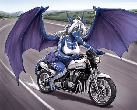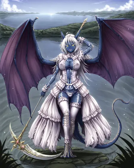 推荐的提示词为 giselle, wings, tail, scales, blue skin, yellow eyes。
