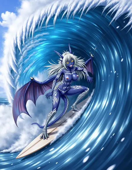 The recommended prompt is giselle, wings, tail, scales, blue skin, yellow eyes.