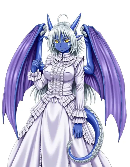 推荐的提示词为 giselle, wings, tail, scales, blue skin, yellow eyes。