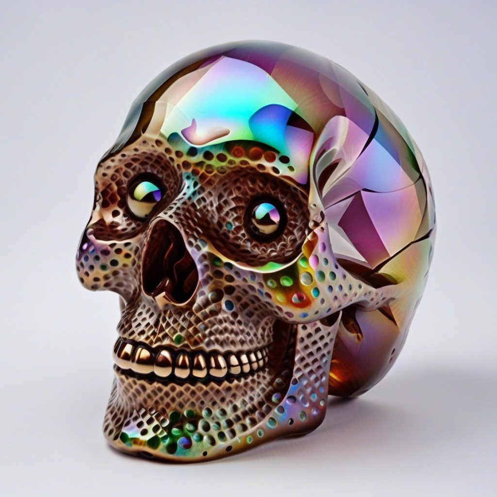 このモデルは、通常顔、頭、マスクに集中して、しわ、亀裂、多くのハニカムパターンを作成します。テクスチャはしばしば光沢があり、たまにやや半透明または透明であり、画像にはインセットや切り抜きがよく含まれます。