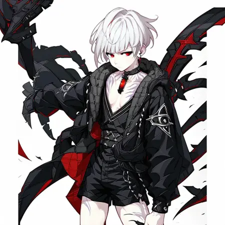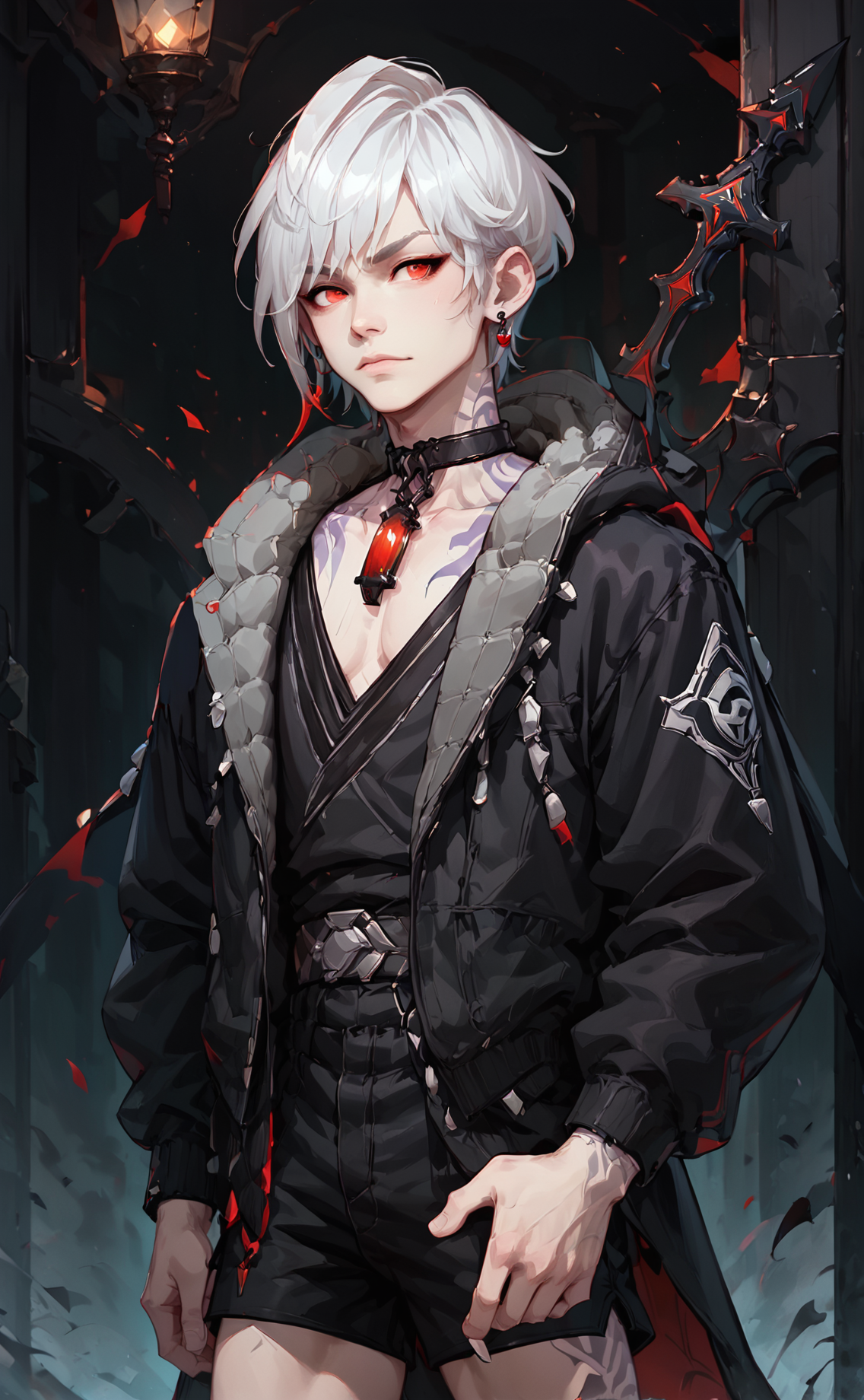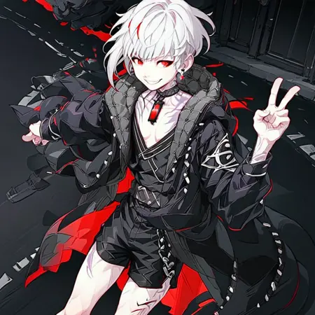 추천 태그: 마른 체형, 흰 머리카락, 짧은 머리, 붉은 눈, 창백한 흰 피부, 문신, 회색 털 장식이 있는 검은 재킷, 빨간 원통 모양 보석이 달린 검은 목걸이, 낮은 목선의 검은 안티, 짧은 반바지, 벨트, 십자형 귀걸이,