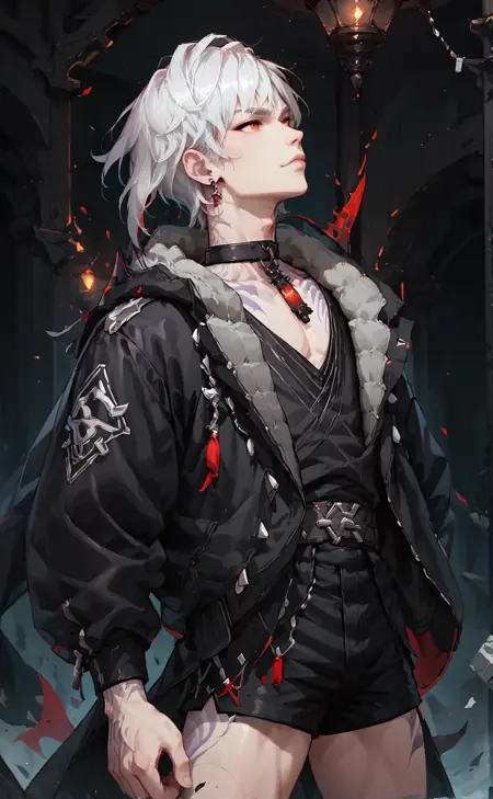 Tags (recommended): slim, white hair, short hair, red eyes, pale white skin, tattoo, black jacket with grey fur trim, black choker with red cylinder gem pendant, black low cut undershirt, short shorts, belt, cross earring,