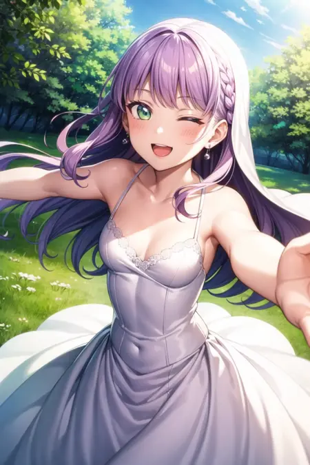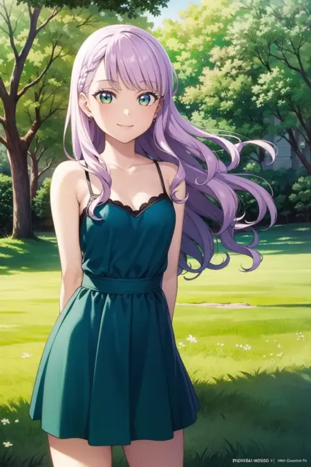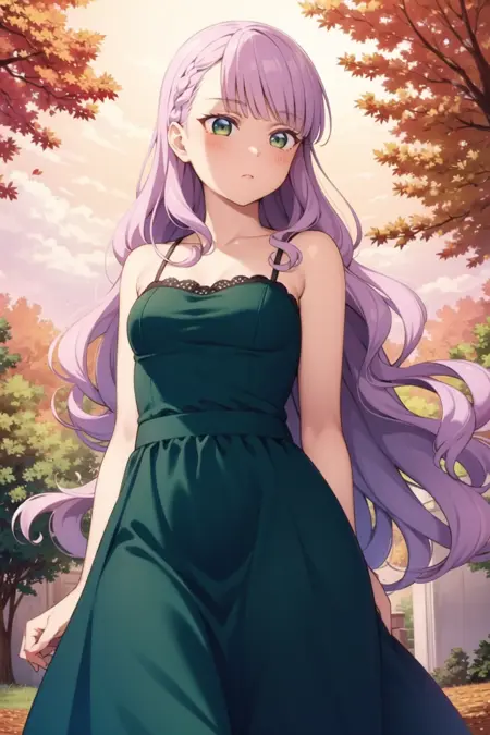 필요한 태그: 1girl, solo, wien margarete, green eyes, long hair, light purple hair, small breasts,