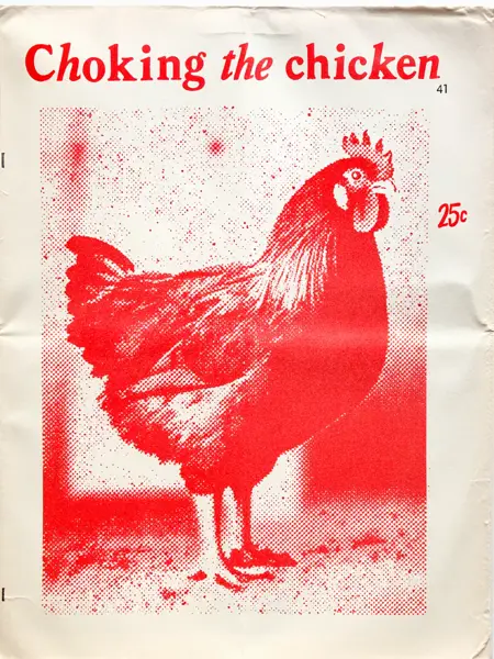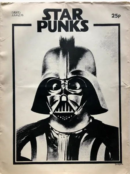 Example:vintage punk fanzine, depicting a monochrome black halftone pattern image of […], the title reads "XYZ". Xerox print with raster effects. "25c".