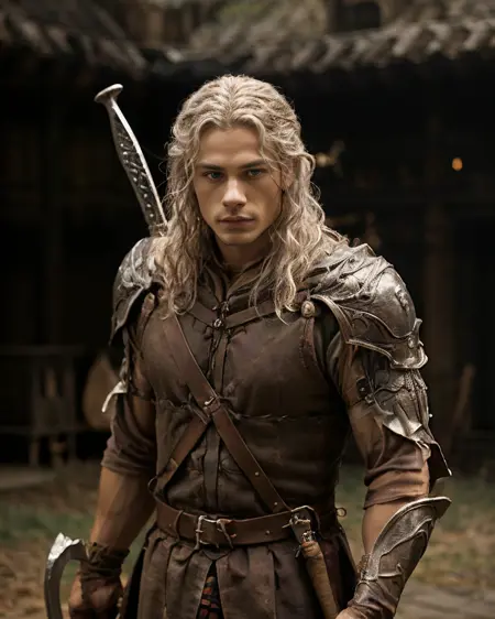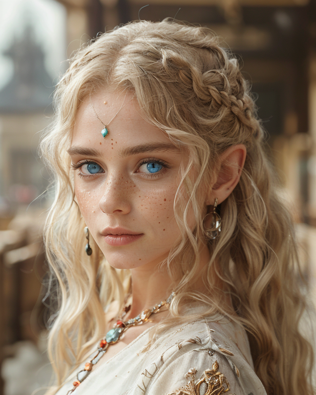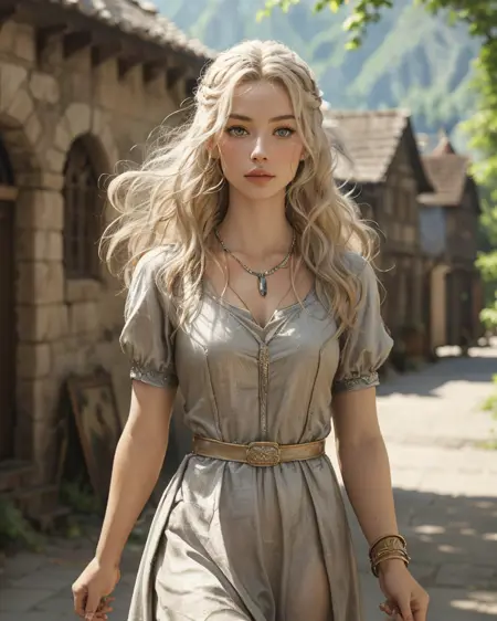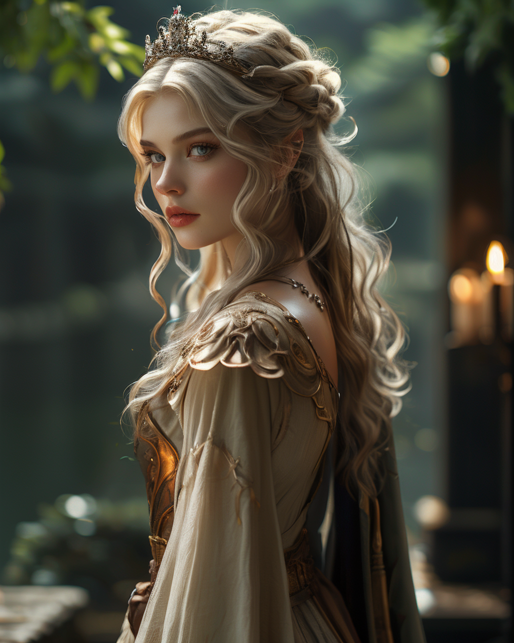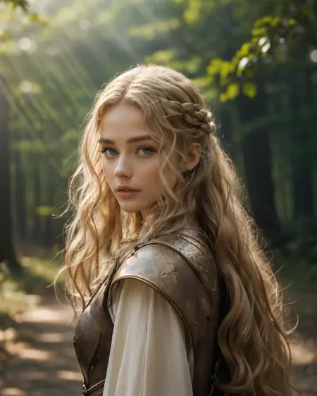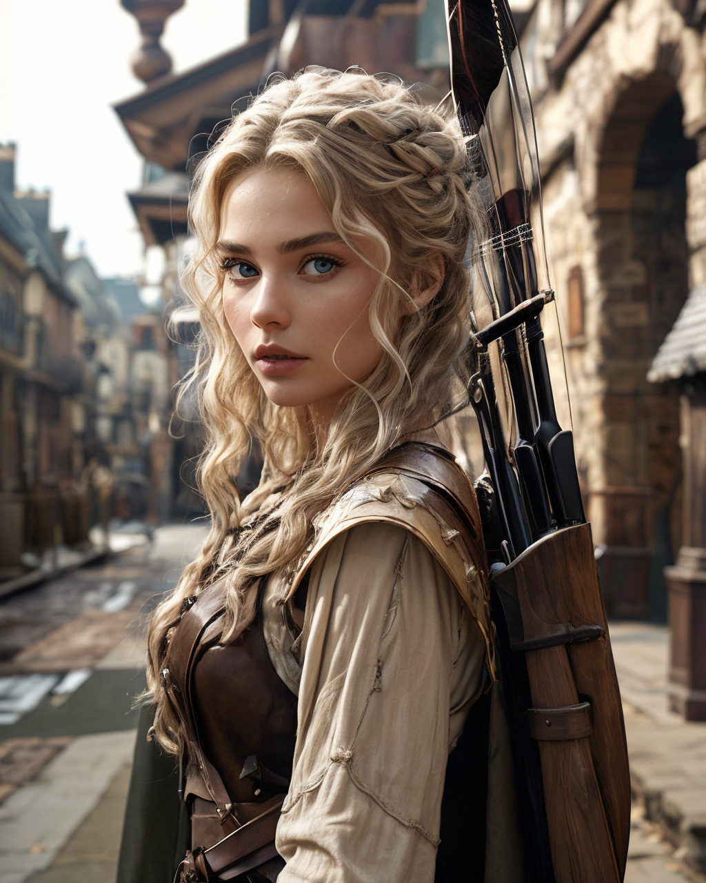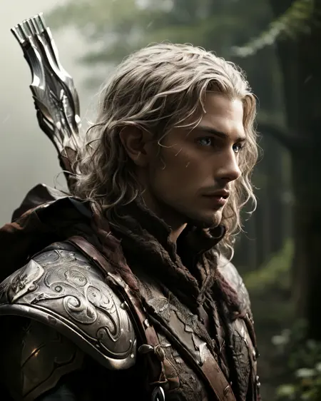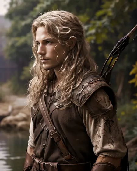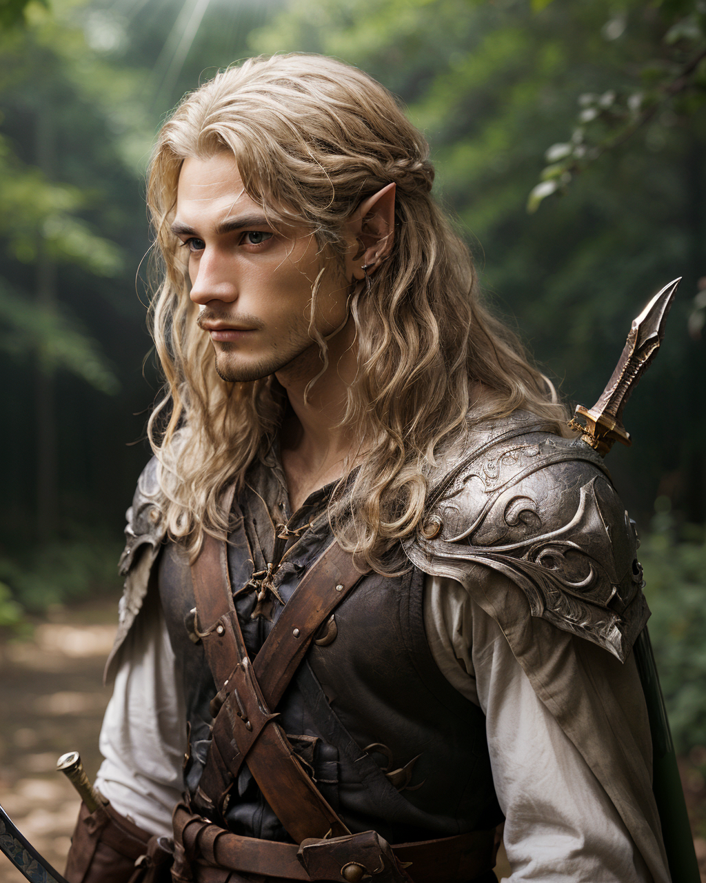 1boy, 1girl, armlet, armor, arrow (projectile), bag, beard, belt, blonde hair, blue eyes, blurry, blurry background, bow (weapon), braid, breastplate, breasts, brown eyes, brown hair, cape, chainmail, circlet, cleavage, closed mouth, crown, depth of field, dress, earrings, facial hair, from behind, gloves, green dress, grey eyes, jewelry, leaf, lips, long hair, looking at viewer, looking to the side, male focus, medium breasts, necklace, outdoors, parted lips, pauldrons, quiver, realistic, rpgelf, scar, sheath, sheathed, shirt, shoulder armor, signature, sleeves rolled up, solo, sword, tiara, tree, tunic, upper body, veil, vest, wavy hair, weapon, white hair, white shirt