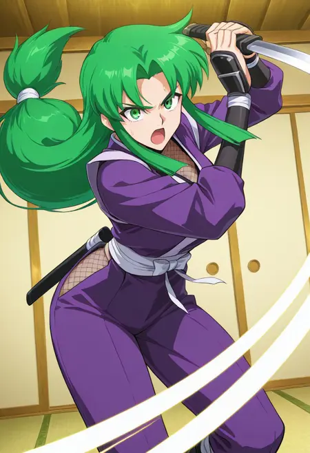 옆머리, 보라색 키모노, 닌자, 타비, 녹색 눈, 피시넷,