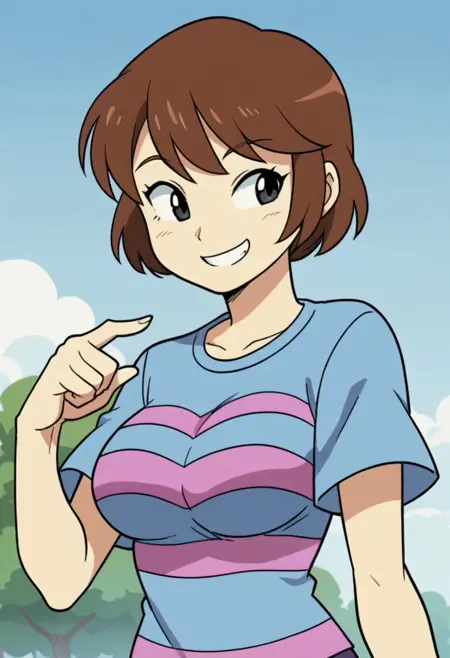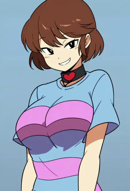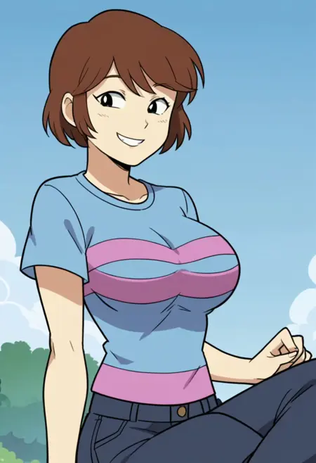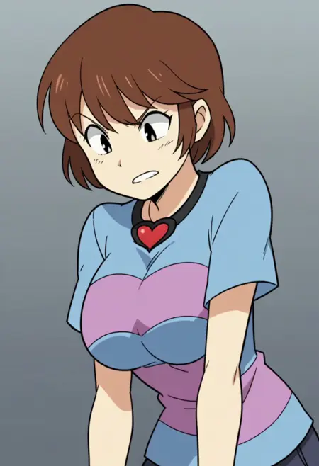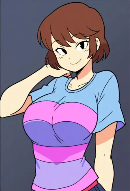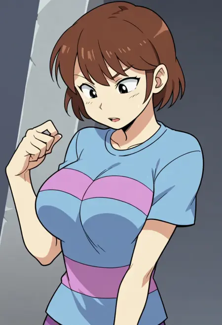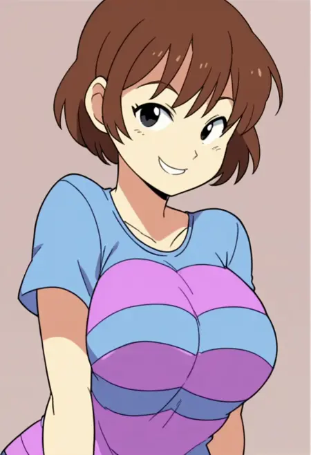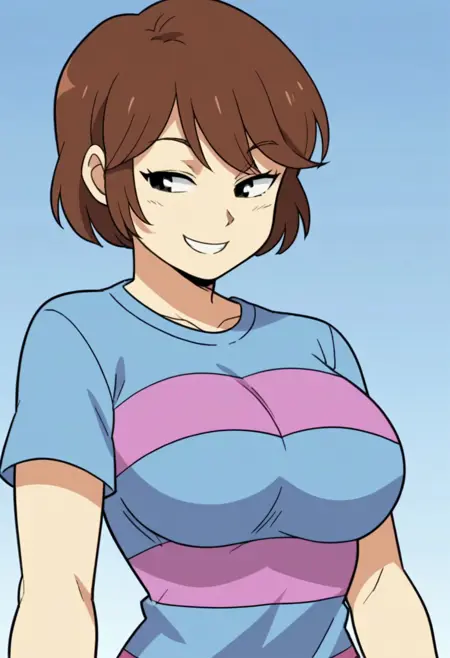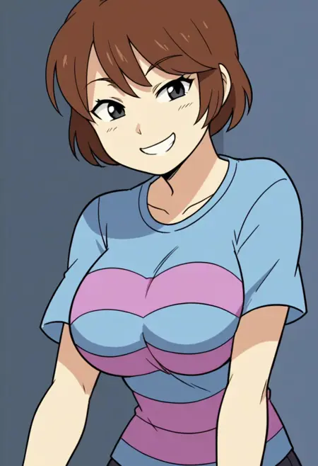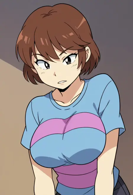 frisk (dezz), brown hair, short hair, black eyes, large breasts,