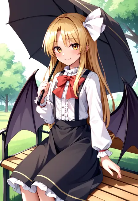 --> 1girl, kurumi (touhou), wings, long hair, bat wings, blonde hair, yellow eyes, bow, shirt, skirt, black suspenders, long sleeves, white hair band