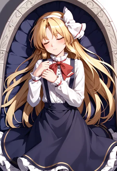 --> 1girl, kurumi (touhou), long hair, blonde hair, bow, shirt, skirt, black suspenders, white hair band, long sleeves, yellow eyes