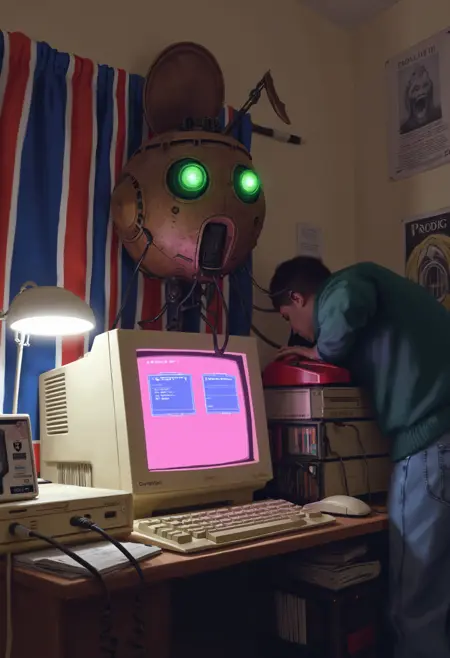 이는 황량한 비 오는 석양 풍경을 그린 디지털 페인팅입니다. 주요 주제는 중간 거리의 도로 위에 서 있는 거대한 인체형 로봇으로, 금속적이고 기계적인 외관을 지니고 있습니다. 로봇의 머리는 오렌지색으로 빛나는 눈으로 밝혀져 있어, 기묘하고 이질적인 느낌을 줍니다. 로봇은 진흙투성이의 땅 위에 서 있으며, 주변에는 다양한 산업용 및 버려진 물건들이 흩어져 있습니다. 전경에는 도로 위에 한 대의 오래되고 낡은 자동차가 로봇을 향해 주차되어 있습니다. 자동차 창문은 어둡고, 뒤쪽의 브레이크 램프는 켜져 있습니다. 도로는 젖고 미끄러우며, 비와 배경의 희미한 빛을 반사합니다. 장면 왼쪽에는 버려진 큰 박스 트럭이 있고, 도로 오른쪽에는 큰 녹이 슬은 컨테이너가 있으며, 그 뒤로 "Matgladja i Konsum"라는 광고看板가 있습니다. 배경은 어두운 흐린 하늘과 멀리 흐릿한 건물과 나무의 실루엣으로 이루어져 있습니다. 전체 색조는 회색, 파랑, 녹색 계열로 이루어져 있으며, 비와 희미한 조명으로 강조됩니다. 그림 스타일은 사실적이면서도 초현실주의적 요소를 포함하여, 황폐한 포스트 아포칼립스 분위기를 포착합니다.