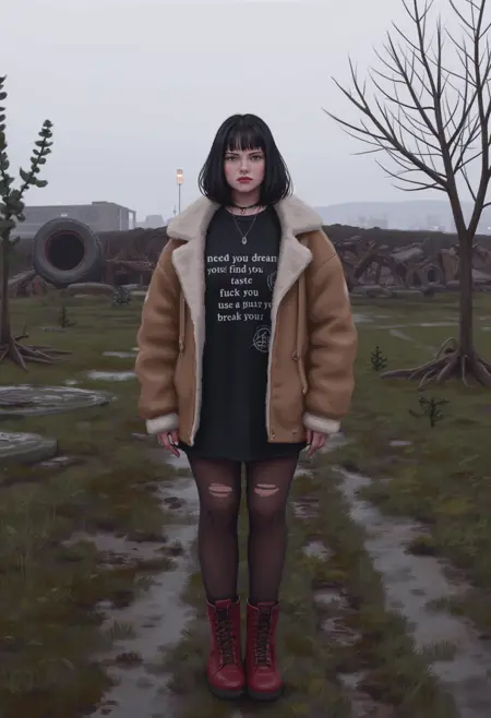 이는 포스트 아포칼립스 또는 디스토피아적 배경에 선 한 젊은 여성의 디지털 일러스트입니다. 피부는 창백하고, 어깨 길이의 검은 머리카락에 약간의 붉은 기운이 있습니다. 표정은 진지하며 약간 찌푸린 듯한 모습입니다. 가벼운 갈색 오버사이즈 슈어링 재킷에 털로 된 칼라를 입었고, 흰색 글자가 적힌 검은 티셔츠를 입고 있습니다. 티셔츠의 글자는 "need you dream you find you taste you fuck you use you scar you break you"이며, 글자 왼쪽에는 원형 기호가 있습니다. 검은색으로 찢긴 스타킹과 빨간 끈 신발을 신고 있습니다. 배경은 희박한 초록 식물과 산란한 잔해로 이루어진 황폐한 냉담한 풍경입니다. 왼쪽에는 잎이 몇 개 남은 작은 나무가 있고, 오른쪽에는 가지가 드문드문한 큰 나무가 있습니다. 땅은 이끼와 흙으로 덮여 있으며, 타이어 자국과 파괴된 건물의 잔해가 보입니다. 하늘은 흐린 상태로, 장면 전체에 무채색의 회색 빛을 비추며 우울한 분위기를 조성합니다. 멀리서는 건물과 가로등의 흐릿한 윤곽이 보이며, 폐허가 된 도시를 암시합니다. 전체 색조는 흙색 계열이 지배적이며, 황폐함과 방임감을 강조합니다. 일러스트 스타일은 매우 세밀하고 사실적이며, 질감과 분위기에 초점을 맞춥니다.
