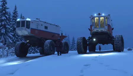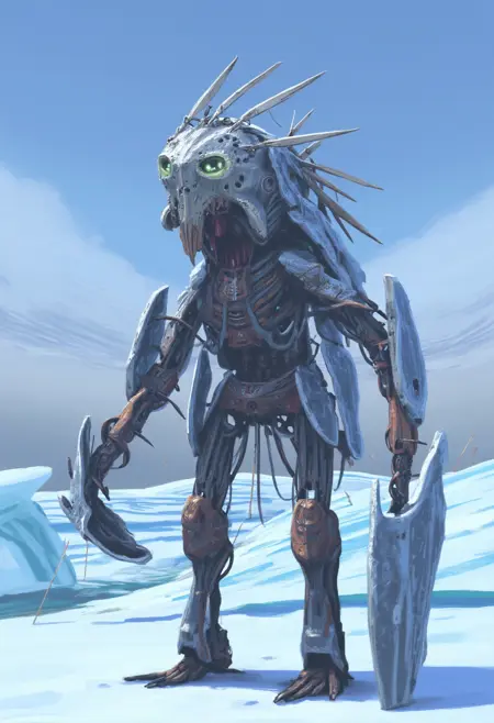 이는 황폐한 눈 덮인 풍경을 그린 디지털 페인팅입니다. 장면은 뒤로 쓰러져 있는 두 대의 큰 금속성 곤충 형태의 기계로 구성되어 있으며, 마치 버려진 듯한 모습입니다. 이 기계들은 이미지 왼쪽에 위치해 있으며, 몸체가 관찰자 쪽을 향해 기울어져 있습니다. 복잡한 기계 부품들로 이루어져 있으며, 옆면에는 큰 원형 돔형 패널과 안테나처럼 뻗어 나온 부분이 있습니다. 기계들은 얇은 눈꽃으로 덮여 있어, 기묘하고 이질적인 외관을 띱니다. 전경에는 눈 덮인 도로가 수평선 쪽으로 부드럽게 휘어져 있으며, 왼쪽에는 최근 차량이 지나간 흔적의 타이어 자국이 보입니다. 도로 양쪽에는 얇은 눈 덮인 잔디가 둘러싸고 있습니다. 도로 오른쪽에는 빨간 금속 기둥 하나가 서 있으며, 길을 표시하거나 경고하는 표지판 역할을 합니다. 둥근 노란색 표지판에는 숫자 50이 쓰여 있어, 도로 표지일 가능성이 높습니다. 배경에는 희미한 하늘을 배경으로 몇 마리의 새가 실루엣으로 보이며, 추운 겨울날임을 시사합니다. 전체 색조는 차가운 블루, 회색, 흰색 계열로 이루어져, 냉각되고 황폐한 분위기를 강조합니다. 붓질은 부드럽고 세밀하며, 눈과 잔디에는 약간의 질감이 느껴져 사실적이면서도 스타일리시한 느낌을 줍니다.