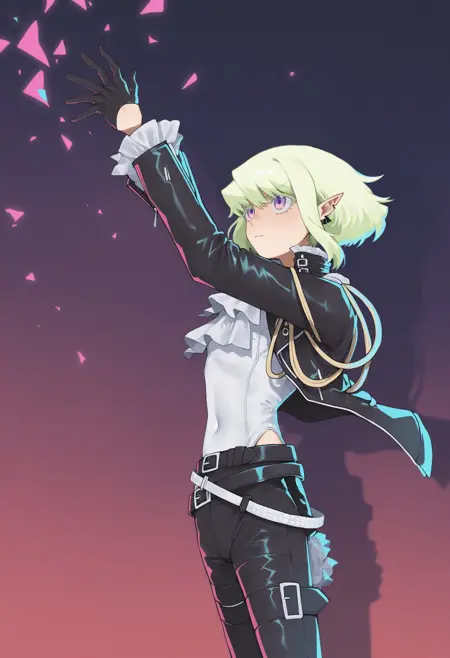 Fleki:エルフ、とがった耳、耳の切り欠き、金髪、波状の髪、長い髪、目の下のクマ、紫の目、短いドレス、白いドレス、茶色の手袋、首輪、茶色の靴、踝ブーツ、