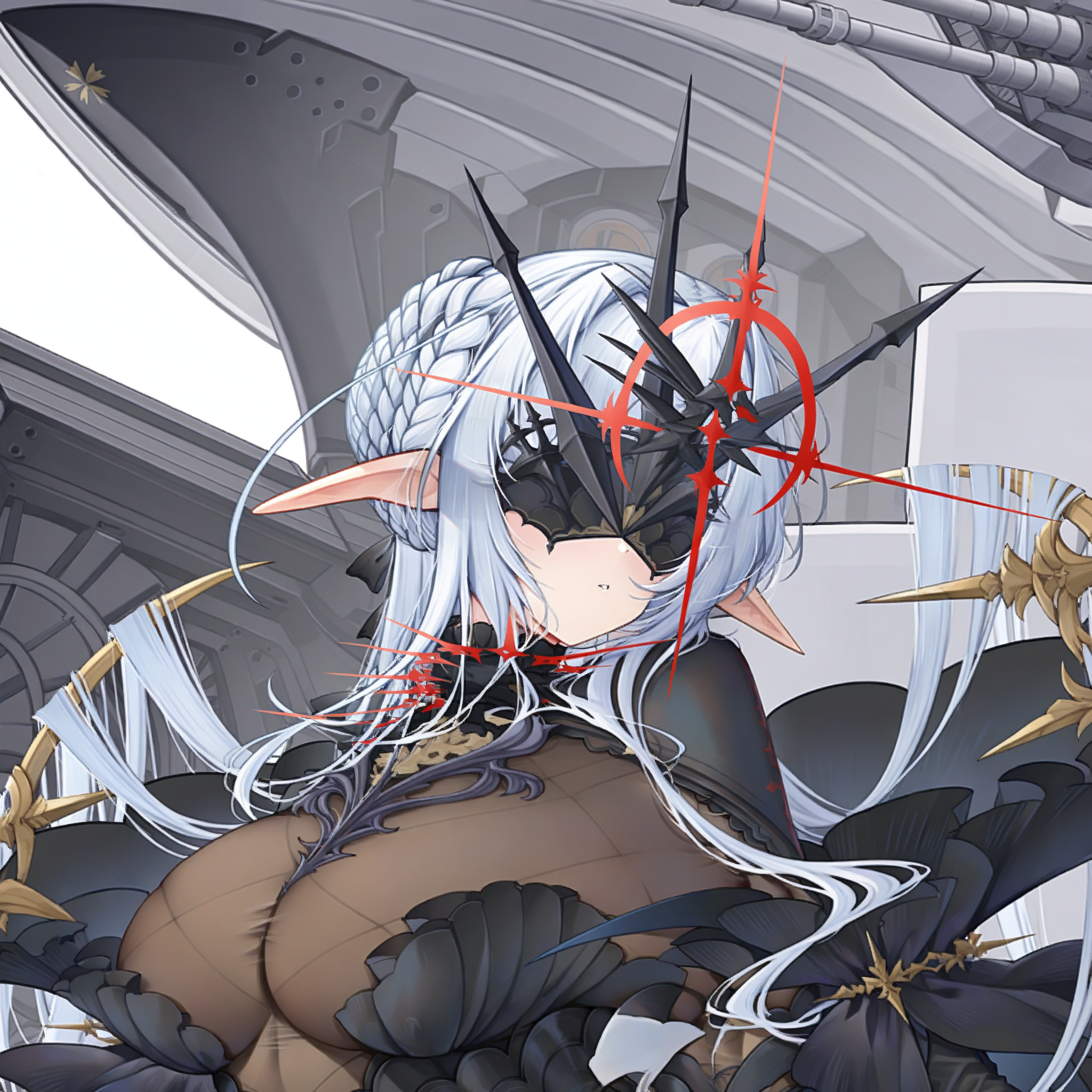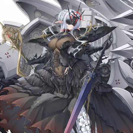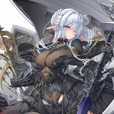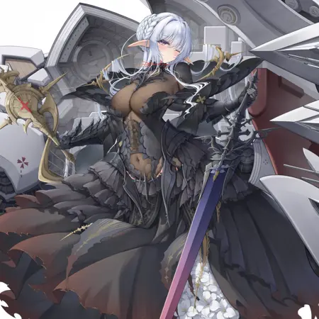 正面提示词:aiii (style1), 1girl, solo, breasts, military vehicle, white hair, black footwear, black gloves, large breasts, long hair, high heels, armor, see-through, see-through cleavage, aircraft, airplane, armored dress, energy, dress, frills, gauntlets, propeller, propeller fighter, black armor, armored leotard, ship deck, elf, white background, weapon, huge weapon, torn clothes, torn dress, leotard, black dress, long dress, standing, legs apart, covered eyes, hair intakes, braid, crown braid, single hair bun, sidelocks, parted lips, facing viewer, black mask, eye mask, holding, holding polearm, holding sword, holding weapon, sword, planted sword, hand on hilt, machinery, rigging, head tilt, multiple weapons, anti-aircraft gun, ship turret, cannon, spiked collar, crosshair, bun with braided base, flower, white flower, side slit, armored boots, drill, spear, planted spear, full body