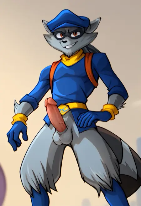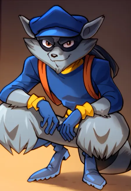 sly cooper, raccoon boy, raccoon boy, 1boy, solo, furry male, furry, grey fur, raccoon ears, raccoon tail, blue hat, blue shirt, black mask, blue boots, thigh strap, blue gloves, backpack,
