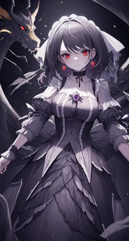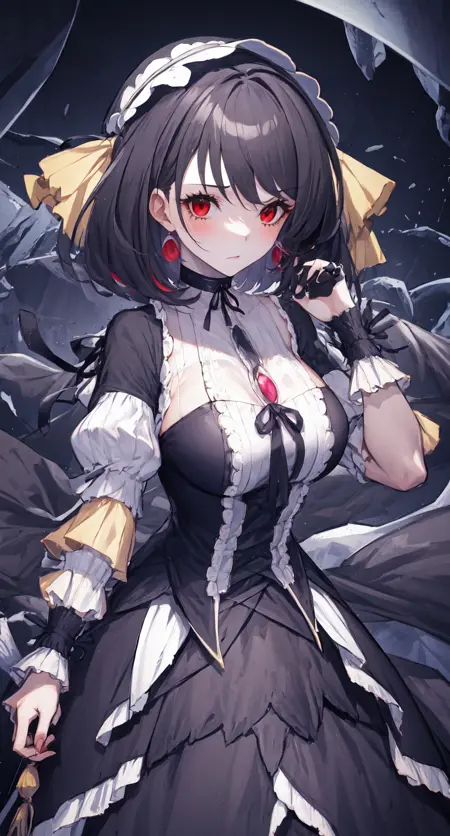 using black hair,hair bow, gem to control detail