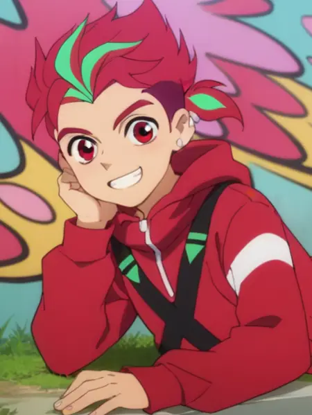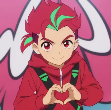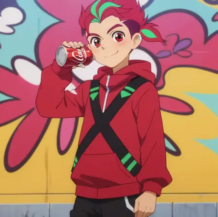 提示:男性,多色头发,双色头发,挑染头发,红发,绿色发梢,马尾,红眼睛,耳环,珠宝,红色连帽衫,黑色短裤,黑色及膝袜,鞋子,室内(更衣室/储物柜),墙上涂鸦