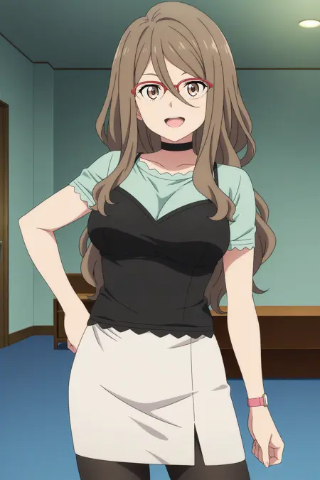 nakahara mizuki, 갈색 머리, 긴 머리, 눈 사이의 머리카락, 옆머리, 빨간 프레임 안경, 프레임 위 안경, 갈색 눈, 초크, 녹색 셔츠, 짧은 소매, 검은 캐미솔, 손목시계, 회색 스커트, 연필 스커트, 검은 팬티스타킹, 검은 신발, 하이힐