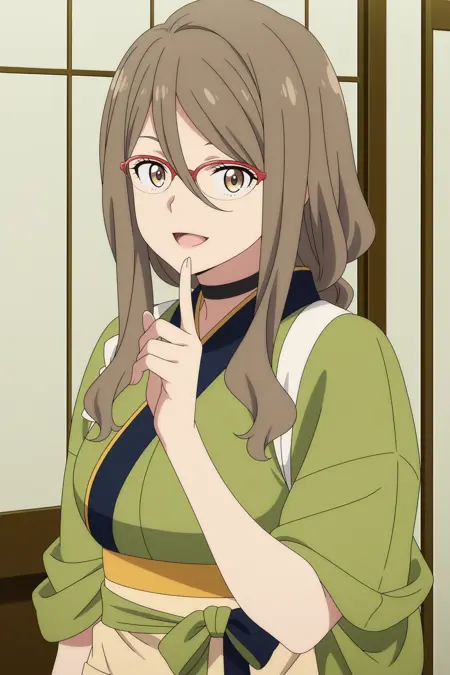nakahara mizuki, 갈색 머리, 긴 머리, 포니테일, 머리끈, 옆머리, 눈 사이의 머리카락, 빨간 프레임 안경, 프레임 위 안경, 갈색 눈, 일본 복장, 기모노, 초크, 녹색 기모노, 짧은 소매, 소매 말아 올리기, 손목 앞치마, 파란 스커트, 긴 스커트, 타비, 조리