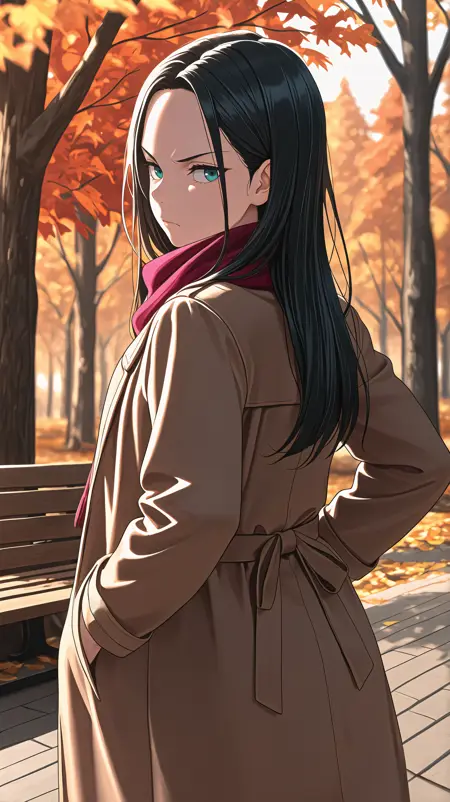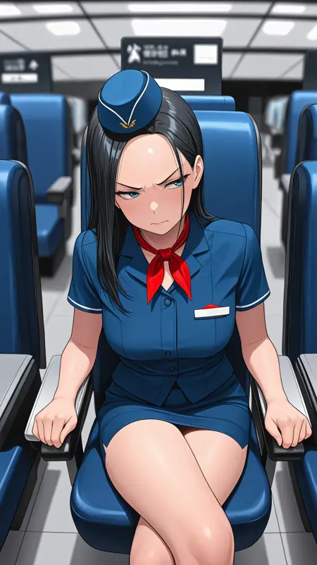 long hair, black hair, forehead, teal eyes, necklace, purple top, long sleeves, black skirt, short skirt, upset,