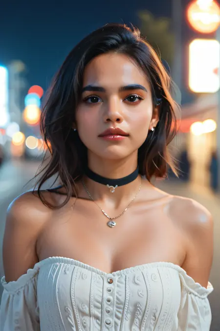 为获得最佳夜景人像效果,请在提示词中结合多种光源。模型在使用“街灯”、“霓虹招牌”和“荧光灯”等词汇时表现最佳。提及“Cinestill 800T”、“红晕”和“钨丝灯白平衡”有助于实现经典的夜间胶片效果,尤其在城市环境中。