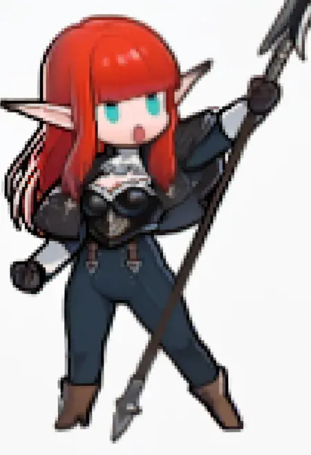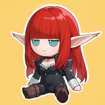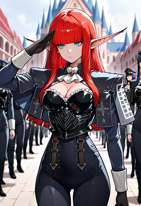 デフォルトの外観: dfHbrg、赤髪、長い髪、ストレートな前髪、サイドロックス、アクア色の目、尖った耳、白いアスコット、胸元、黒いブレストプレート、黒いキャプリ、濃い青のハイウエストパンツ、長い袖、濃い青の袖、黒い手袋