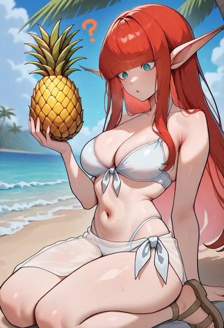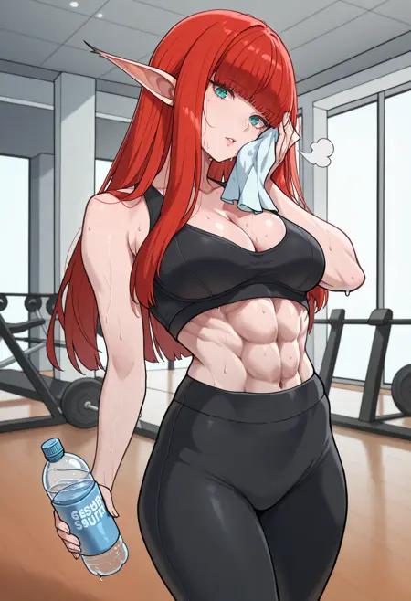 カスタム服装: dfHbrg、赤髪、長い髪、ストレートな前髪、サイドロックス、アクア色の目、尖った耳