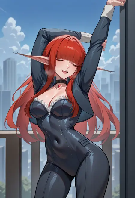 カジュアルな服装: csHbrg、赤髪、長い髪、ストレートな前髪、サイドロックス、アクア色の目、尖った耳、黒いチョーカー、ペンダントチョーカー、鎖骨、胸元、黒いボディスーツ、フリル、黒いジャケット、短めのジャケット、開いたジャケット、長い袖