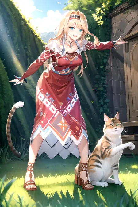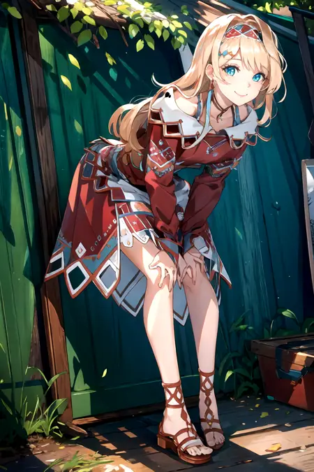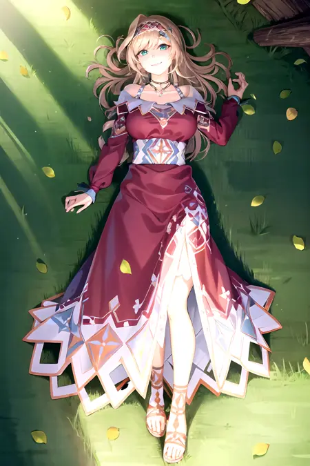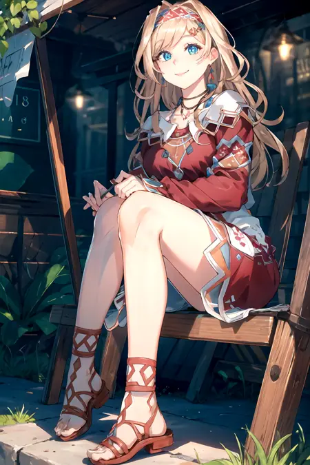 long hair, blonde hair, dress, jewelry, braid, hairband, red dress, sandals,