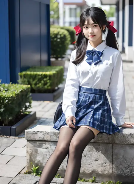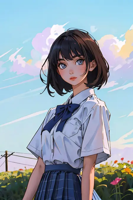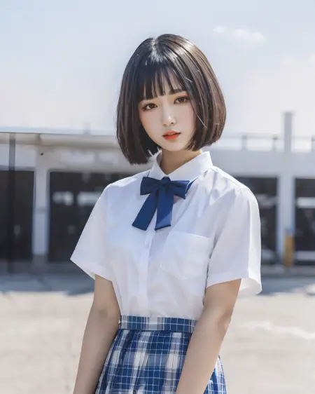 Prompt: jk, 1girl, solo, short hair, looking at viewer, breasts, black hair, closed mouth, white shirt, blue skirt, upper body, blue bow,lora:jk\_v3:0.6