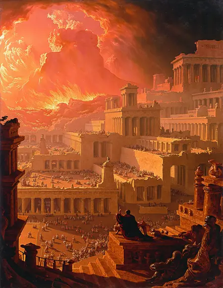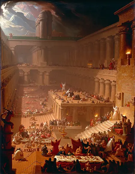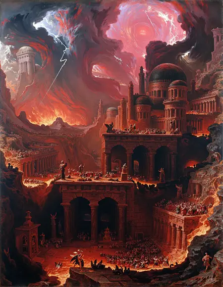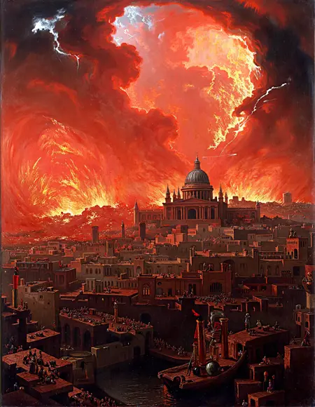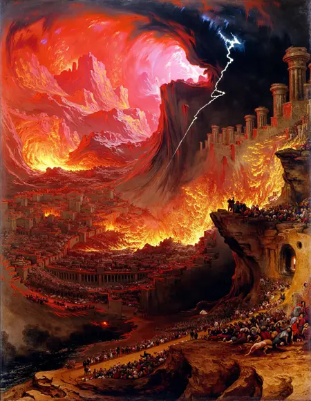 马丁的画作常描绘洪水、风暴和火山喷发等灾难性事件,引发观者既敬畏又恐惧的情感。