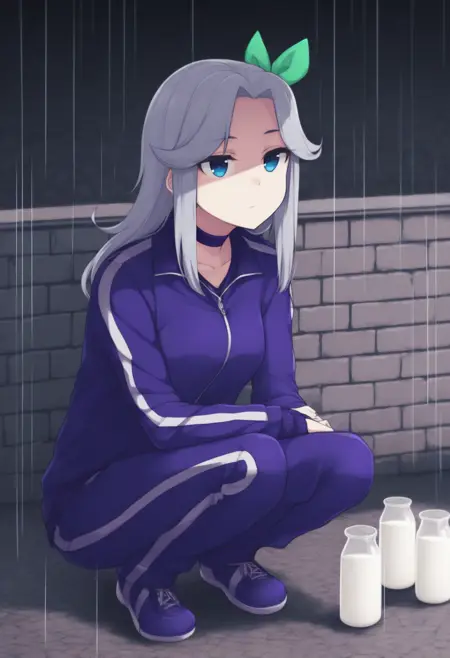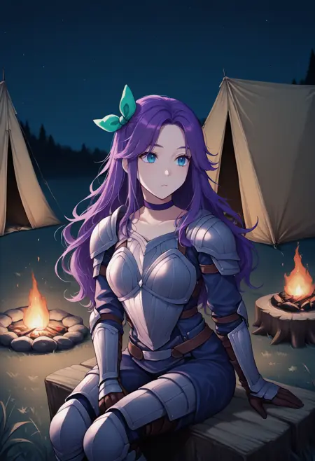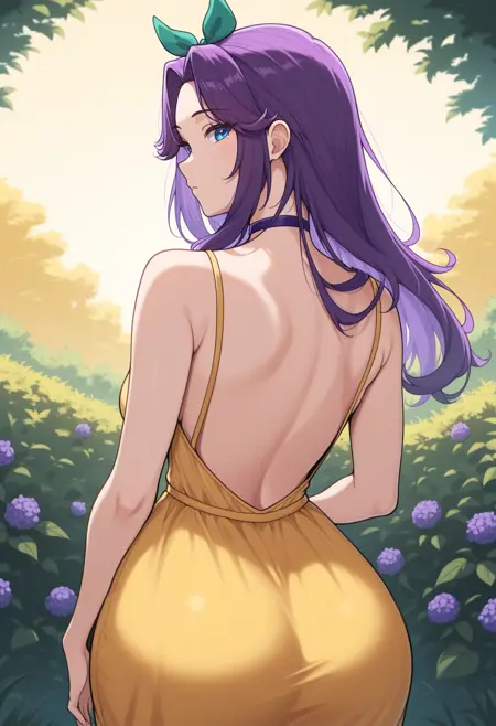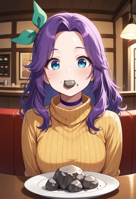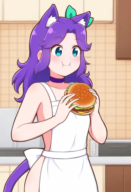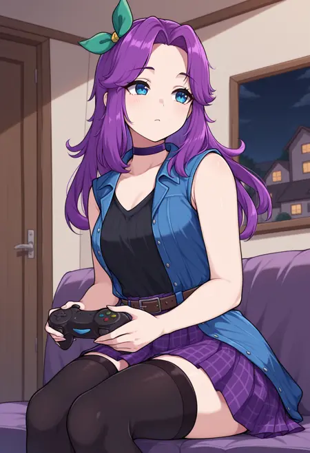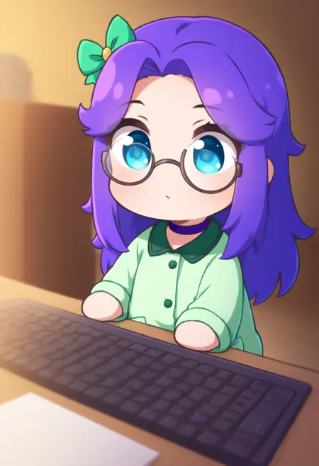 Main Prompts for whatever outfit: NSAbigailMisc, blue eyes, purple hair, long hair, parted bangs, hair bow, green bow, purple choker.