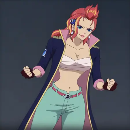 DesireOP, 1girl, solo, red hair, multicolored hair, blue eyes, makeup, lips, lipstick, earrings, long hair, large breast, cleavage, sarashi, fingerless gloves, streaked hair, coat, navel, midriff, groin, pants, belt, boots, collarbone, japanese street thugs coat, ocean print on coat, kanji on coat, wallet chain,