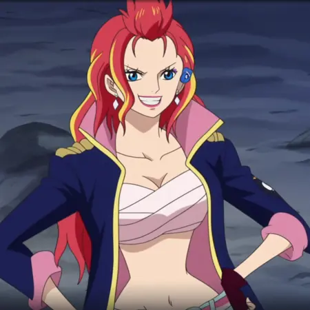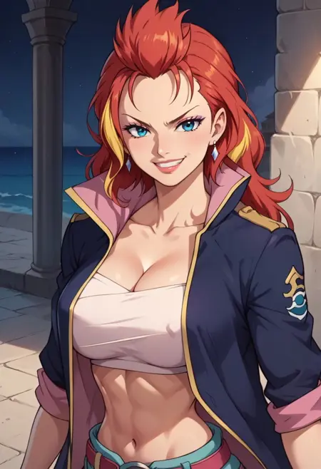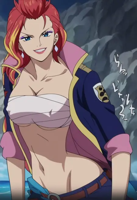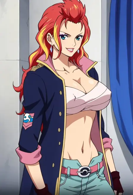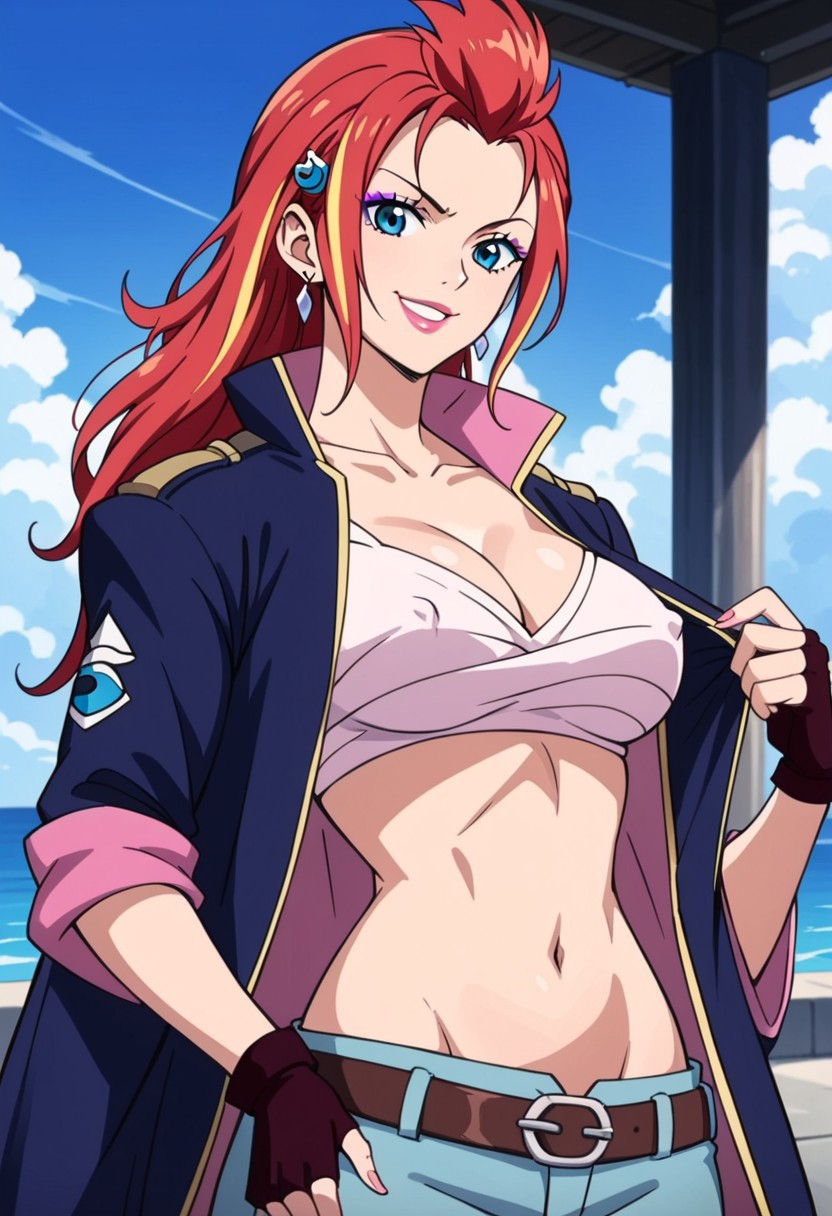 DesireOP、1人 Girl、シングル、赤髪、多色髪、青い瞳、メイク、唇、リップストック、イヤリング、ロングヘア、大きな胸、胸元、巻き帯、指なしグローブ、ストライプ髪、コート、へそ、腹部、鼠径部、パンツ、ベルト、ブーツ、鎖骨、日本のストリートギャングコート、コートに海のプリント、コートに漢字、ウォレットチェーン、