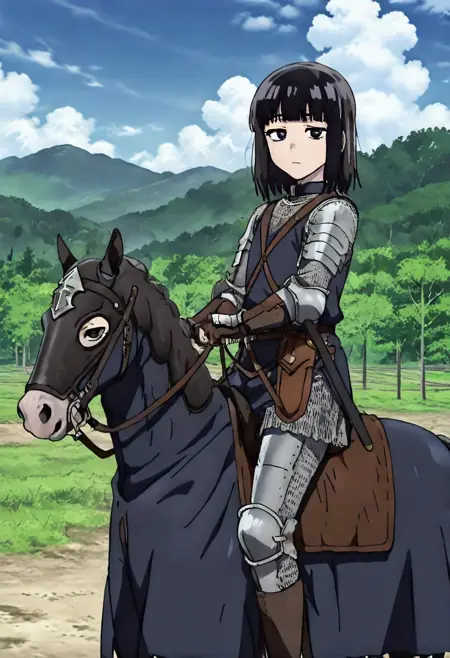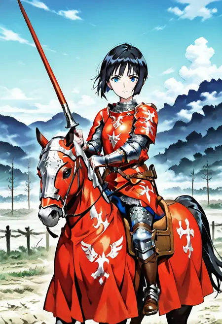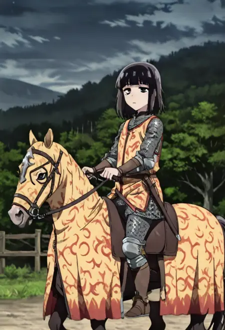 This Lora features riding a horse with Caparison. Adding prompt such as 'chainmail' or 'armor' will typically generate a knight with decent appearance, albeit somewhat mixed in armor style.