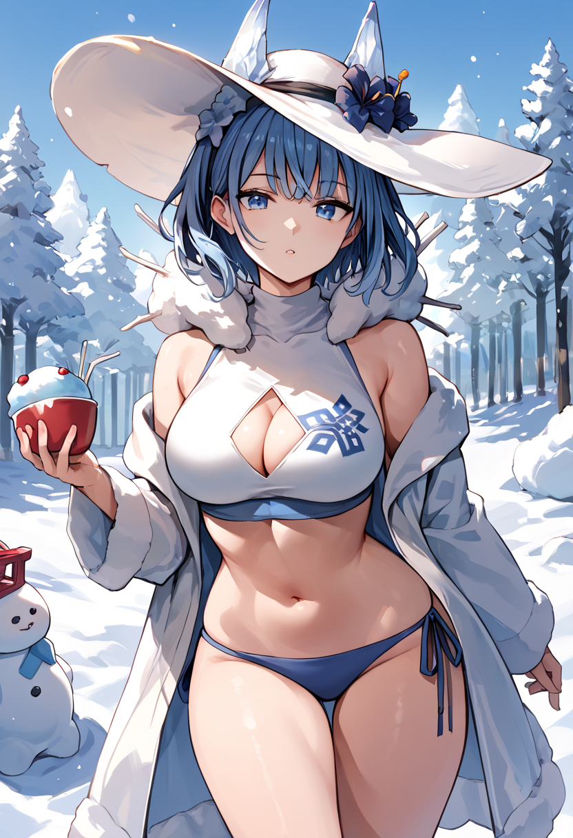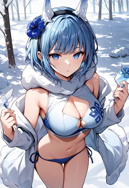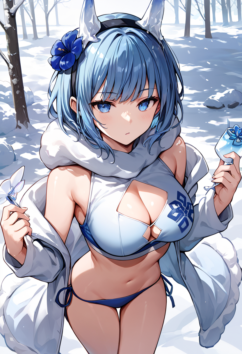 ベースプロンプト(サマーバージョン): sum_nifl, 髪の花, 白い頭部装具, ハット, 青い髪, 短い髪, 青い目, 前髪, 青いビキニ, 胸元のカットアウト, 衣装のカットアウト, ジャケット