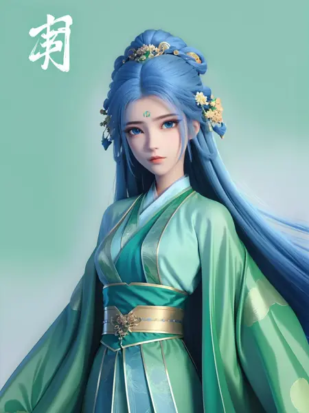 - 1 girl,hanfu,green chinese clothes, obi,hair ornament, long hair, forehead mark, blue eyes, upper body,