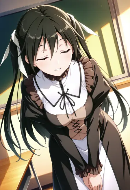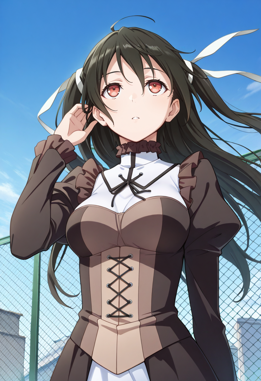 基础:skanade, 1girl, solo, two side up, long hair, black hair, hair ribbon, white ribbon, red eyes, dress, long sleeves, black dress, medium breasts,