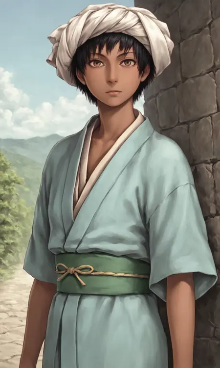 farsamiotoyomegatari, dark skin, turban, black hair, brown eyes