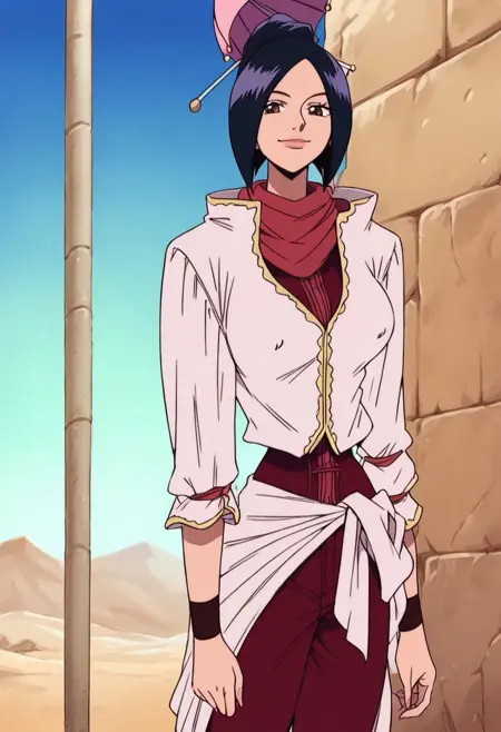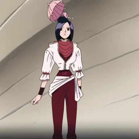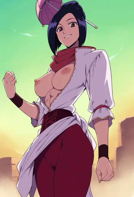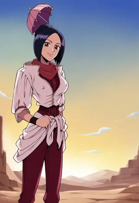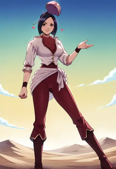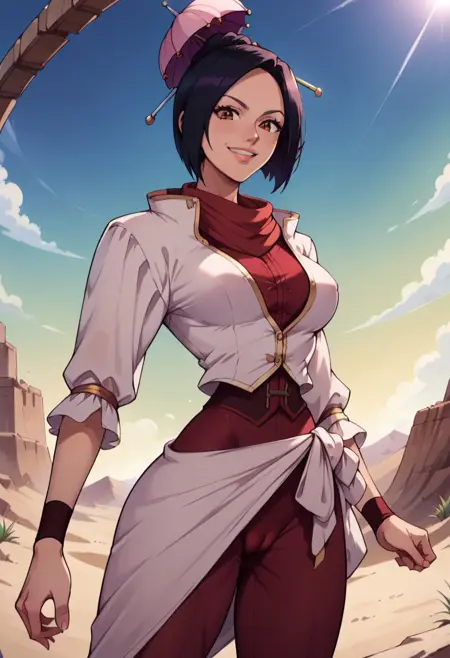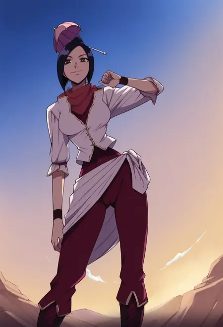 RasaOP、1girl、solo、背の高い女性、細身の女性、黒髪、短髪、茶色の目、大きな胸、白い肌、紫のシャツ、上に白いブラウス、赤いスカーフ、長い深紅のパンツ、カーブした茶色のブーツ、片側の髪の結び目、髪飾り、髪の傘、ジャケット、スカーフ、サッシュ、リストバンド、髪の棒