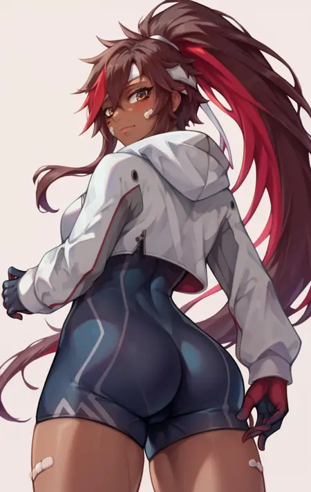 JulietteSDXL,1girl,solo,long hair,brown hair,gloves,long sleeves,hair between eyes,brown eyes,ponytail,red hair,dark skin,hood,dark-skinned female,streaked hair,bodysuit,hoodie,covered navel,white headband,bandaid,bandaid on face,white hoodie